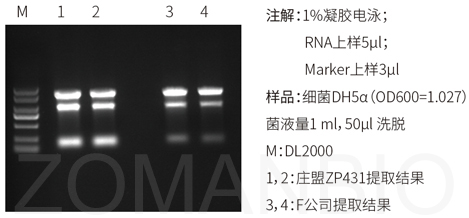 以上參考圖分別取50mg燕麥葉片,20mg小鼠肝臟和1ml細(xì)菌DH5α菌液各數(shù)份,組織進(jìn)行液氮研磨處理,菌液離心收集細(xì)胞后,分別加入1ml Zomanbio RNApure 和 T、I公司相應(yīng)產(chǎn)品,按各自說(shuō)明書(shū)進(jìn)行RNA提取。洗脫體積分別為80μl、100μl、60μl。RNA電泳上樣量分別為5μl,1%瓊脂糖凝膠電泳。