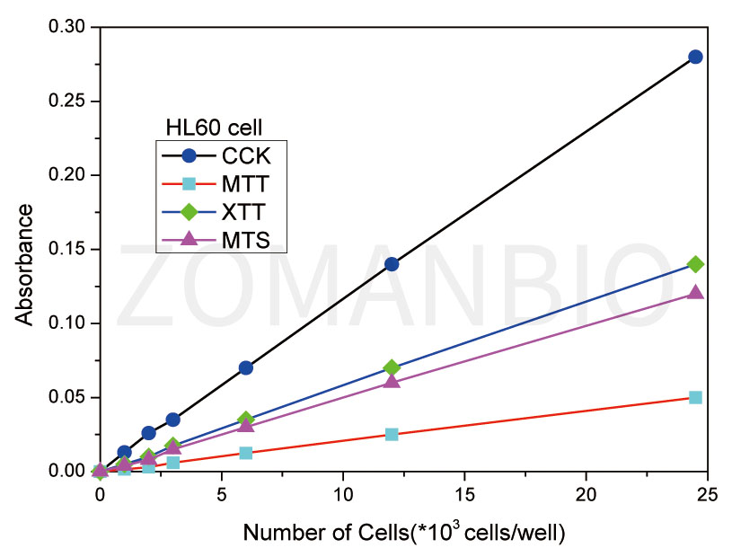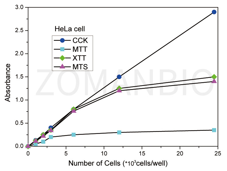 Detection: CCK@450nm; XTT@450nm; MTS@ 490nm; MTT@ 570nm