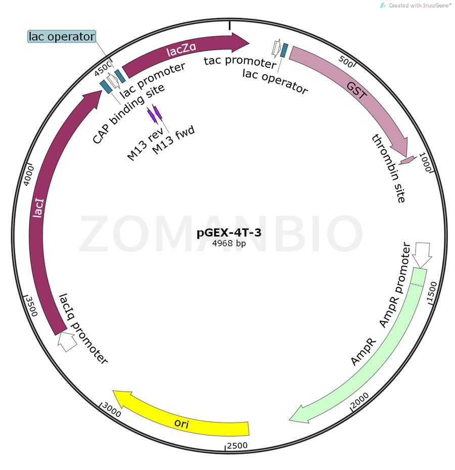 pGEX-4T-3是一個大腸桿菌表達載體質(zhì)粒,可通過MCS處的酶切位點連入目的基因,Tac啟動子啟動GST促溶標簽和目的基因融合表達。質(zhì)粒只保證關(guān)鍵序列正確,不保證表達效果。
