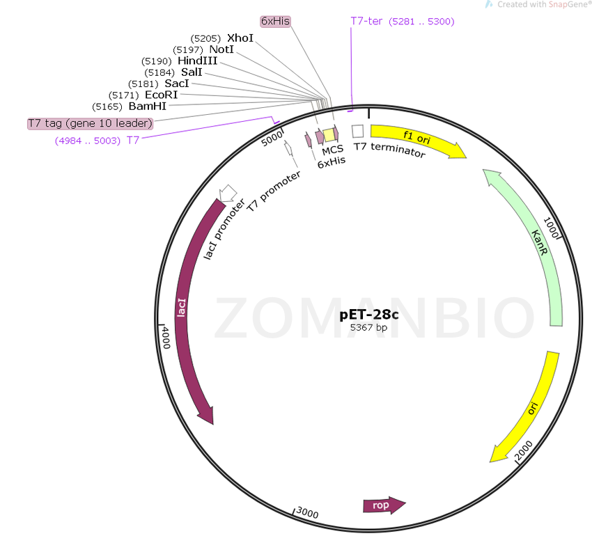 pET-28c質(zhì)粒是一種原核表達(dá)載體,C端含有一個(gè)6×His標(biāo)簽,N端含有一個(gè)thrombin位點(diǎn)、6×His標(biāo)簽和T7標(biāo)簽。該質(zhì)粒含有多個(gè)常用的酶切位點(diǎn),便于不同基因克隆。表達(dá)由宿主細(xì)胞提供的T7 RNA聚合酶誘導(dǎo),目的基因被克隆到質(zhì)粒載體上,受噬菌體強(qiáng)轉(zhuǎn)錄及翻譯信號(hào)控制。