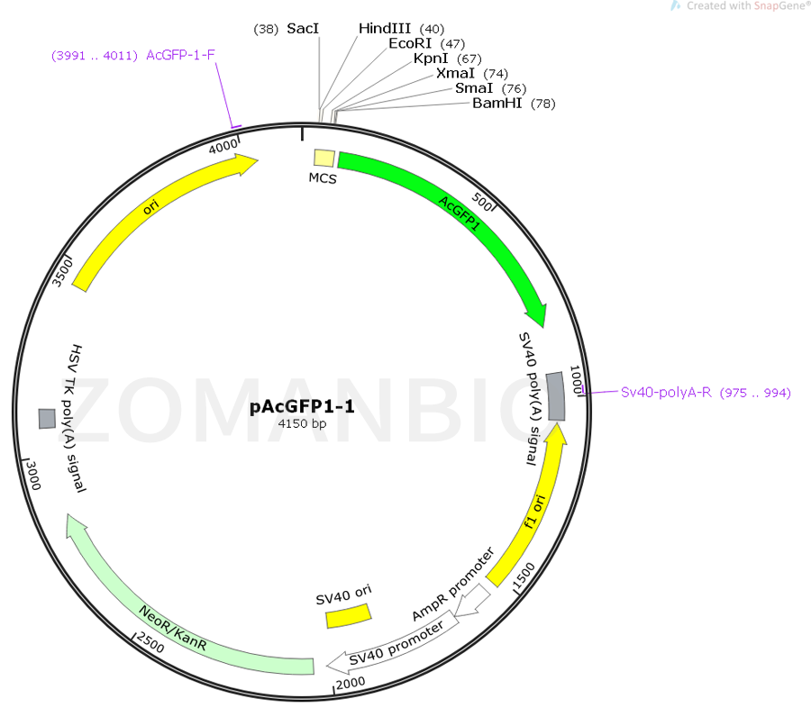 pAcGFP1-1質(zhì)粒是 AcGFP的衍生物,來自Aequorea coerulescens。 AcGFP1已經(jīng)優(yōu)化了更亮的熒光。(激發(fā)最大值= 475nm;發(fā)射最大值= 505nm)AcGFP1基因的編碼序列含有沉默堿基變化,其對應(yīng)于人類密碼子使用偏好。