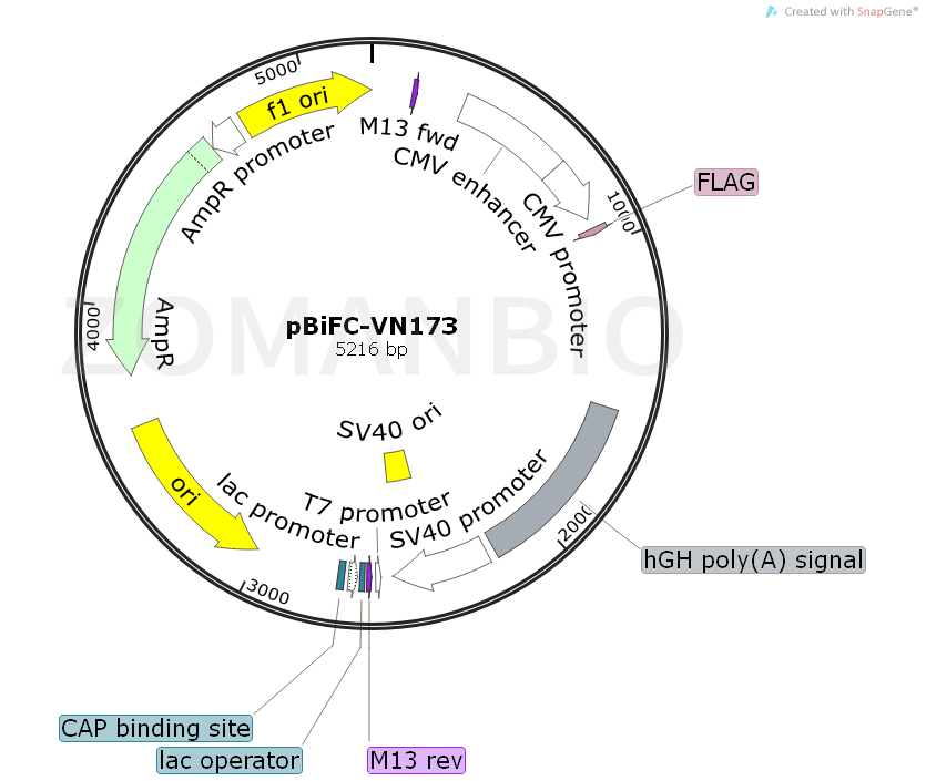 BiFC-VN173 by pFlag-CMV Xba I and BamHI carrier in the site of insertion of the VN173 gene, the plasmid is high copy plasmid, VN173 gene derived from Vitoria victoria. Visualization of Aequorea Aequorea ternary complexes in living cells by using a BiFC-based FRET analysis. Nature Protocols, 3:1693-1702 (2008).