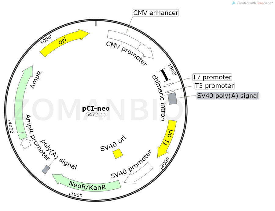 pCI-neo Mammalian Expression Vector(pCI-neo 哺乳動(dòng)物表達(dá)載體) 攜帶有人類巨細(xì)胞病毒(CMV) 的即刻早期增強(qiáng)子/ 啟動(dòng)子區(qū)域,來促進(jìn)哺乳動(dòng)物細(xì)胞中插入克隆DNA 的組成型表達(dá)。此載體也帶有新霉素磷酸轉(zhuǎn)移酶基因, 一種哺乳動(dòng)物細(xì)胞的選擇性標(biāo)志物。通過G-418 抗性篩選轉(zhuǎn)染細(xì)胞,pCI-neo 載體能夠用于瞬時(shí)或穩(wěn)定表達(dá)。