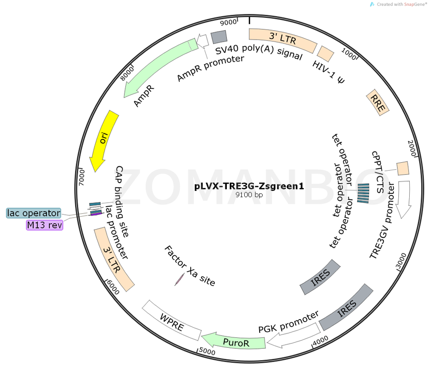The inducible promoter PTRE3G provides for very low basal expression and high maximal expression after induction. It consists of 7 repeats of a 19 bp tet operator sequence located upstream of a minimal CMV promoter. PTRE3GV is a version of PTRE3G that was modified at Clontech for higher performance in lentiviruses and retroviruses. In the presence of Dox, Tet-On 3G binds specifically to PTRE3GV and activates transcription of the downstream GOI. PTRE3GV lacks binding sites for endogenous mammalian transcription factors, so it is virtually silent in the absence of induction. pLVX-TRE3G-ZsGreen1 is an HIV-1-based, inducible lentiviral expression vector that allows the simultaneous expression of ZsGreen1 and your protein of interest in virtually any mammalian cell type, including primary cells.