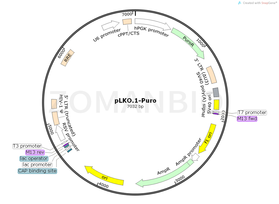 pLKO.1-Puro is a cloning vector of shRNA, originally derived from HIV-1. It contains all the necessary cis-elements for packaging, reverse transcription, and integration for subsequent production of the lentiviral particles.