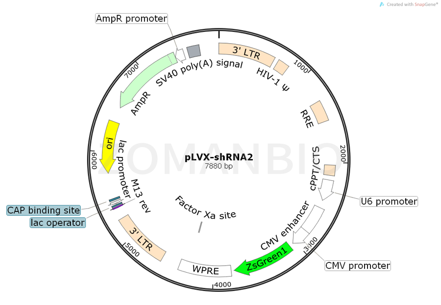 pLVX-shRNA2 is an HIV-1-based, lentiviral expression vector designed to express a small hairpin RNA (shRNA) for RNA interference (RNAi) studies. Expression of your shRNA is driven by the RNA Pol III-dependent, human U6 promoter (PU6), located just upstream of the MCS.