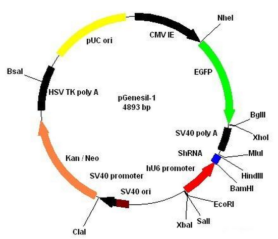 The pGenesil-1 plasmid was obtained by the transformation of pEGFP-C1 plasmid. PEGFP-C1 plasmid has been widely used in mammalian cells for many years, it has fluorescent protein expression, it is very convenient to detect the effect of. When your target gene was not detected by conventional fluorescence detection, the pGenesil-1 plasmid encoding shRNAs was a better choice.