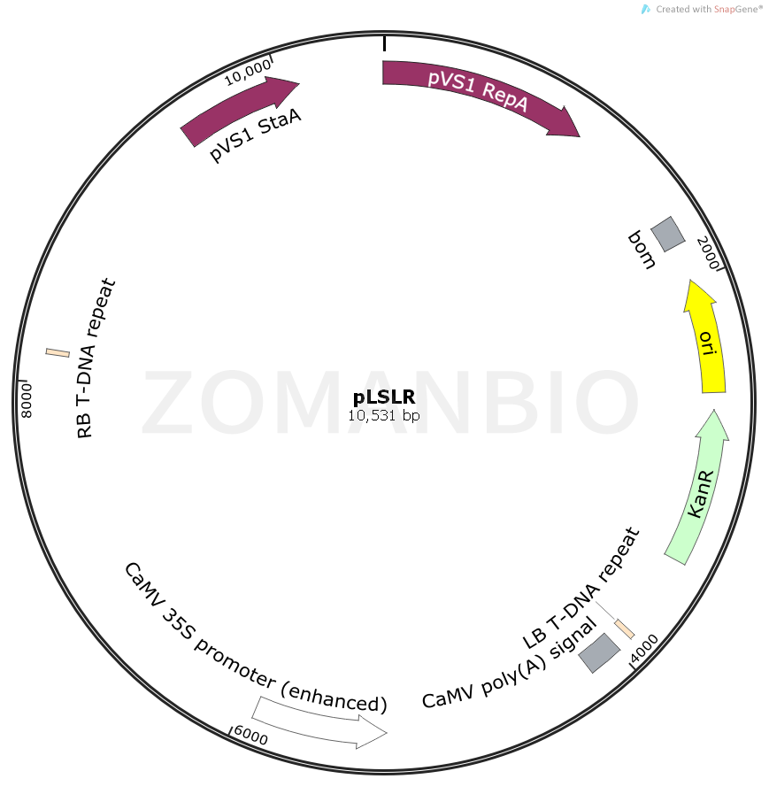 pLSLR是一個植物的T-DNA質(zhì)粒,擁有潮霉素篩選標(biāo)記。Single component plant T-DNA plasmid. Contains cis- and trans-acting replicational elements from the bean yellow dwarf virus in an LIR-SIR-Rep/RepA-LIR orientation.