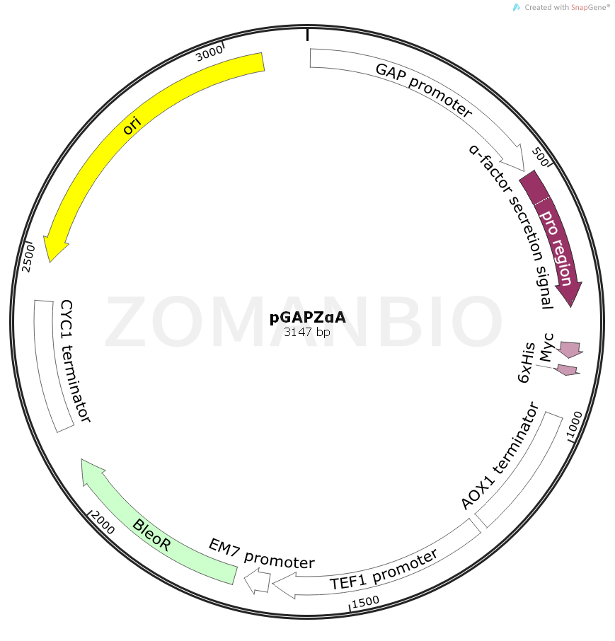 甘油醛-3-磷酸脫氫酶(GAPDH)的酶在許多生物細(xì)胞中包括畢赤酵母,穩(wěn)定高水平表達(dá)。最近GAPDH蛋白編碼基因啟動(dòng)子(GAP)被深入研究,并在畢赤酵母中能夠高水表達(dá)重組蛋白,這取決于使用的碳源(Waterham等 人,,1997)。GAP啟動(dòng)子(PGAP)的重組蛋白表達(dá)水平略高于AOX1啟動(dòng)子。pGAPZ A,B,和C載體(2.9 KB)和pGAPZαB和C(3.1 KB)載體使用GAP啟動(dòng)子在畢赤酵母中穩(wěn)定表達(dá)重組蛋白。重組蛋白表達(dá)為為帶有C-末端myc抗原表位和C端His標(biāo)簽的融合蛋白。此外,pGAPZα 表達(dá)的融合蛋白在N-端帶有釀酒酵母(Saccharomyces cerevisiae)的α-因子分泌信號(hào)肽。這兩個(gè)系列的載體都提供三個(gè)不同讀碼框的載體,以方便克隆的帶有C-端標(biāo)簽和/或N-末端分泌信號(hào)肽的載體中。