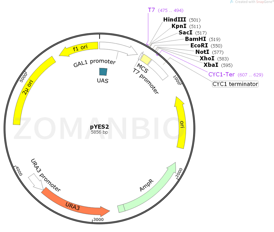 pYES2的是一個(gè)5.9 kb的載體,設(shè)計(jì)用來在釀酒酵母(Saccharomyces cerevisiae)中誘導(dǎo)表達(dá)重組蛋白。載體的特點(diǎn)在于基因插入載體的構(gòu)建簡單,以及能夠使用原養(yǎng)型尿嘧啶進(jìn)行轉(zhuǎn)化株的篩選。