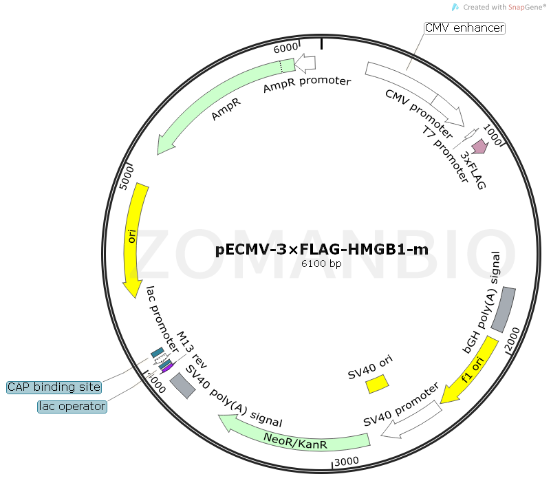pECMV-3×FLAG-HMGB1-m質(zhì)粒是在pECMV-3×FLAG載體的基礎(chǔ)上改造而成,CMV啟動(dòng)小鼠源HMGB1基因的過表達(dá),N端的3×FLAG融合標(biāo)簽?zāi)芎芎玫谋籉LAG抗體識(shí)別。該質(zhì)??勺鳛檫^表達(dá)質(zhì)粒直接轉(zhuǎn)染哺乳細(xì)胞。質(zhì)粒本身帶有Neo篩選標(biāo)記,可用G418篩選轉(zhuǎn)染后的細(xì)胞得到穩(wěn)轉(zhuǎn)細(xì)胞系。