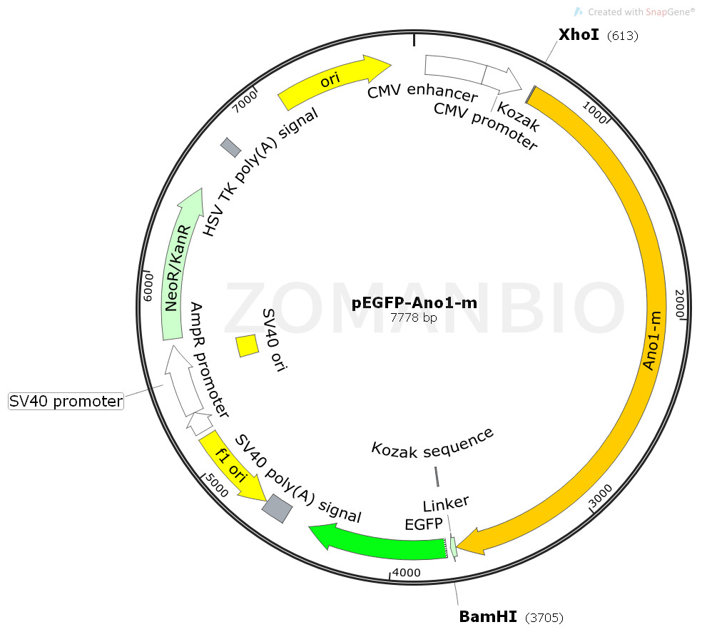 pEGFP-ANO1-m是一個小鼠ANO1基因的哺乳細(xì)胞過表達(dá)質(zhì)粒。