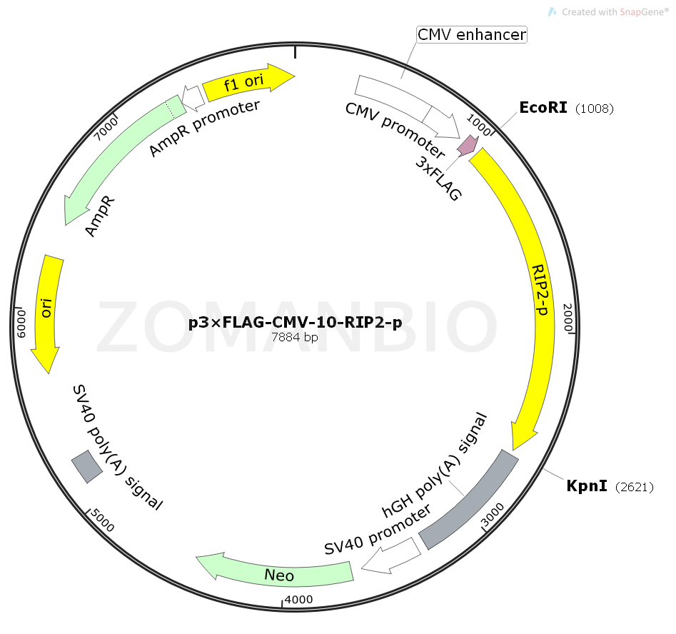 p3×FLAG-CMV-10-RIP2-p質(zhì)粒是一個(gè)豬源基因過表達(dá)質(zhì)粒,CMV啟動(dòng)子驅(qū)動(dòng)3×FLAG標(biāo)簽和RIP2基因融合表達(dá)。