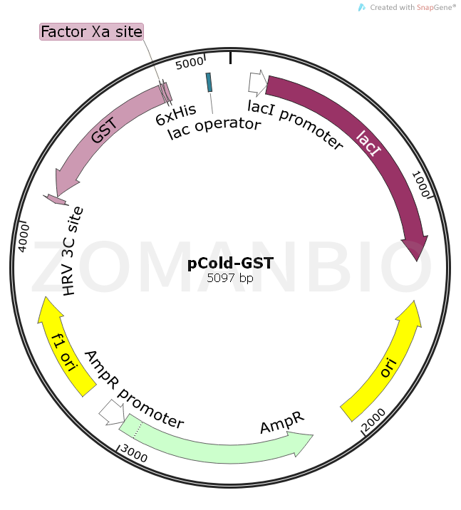 功能簡介: | pCold-GST載體表達(dá)GST融合蛋白,GST標(biāo)簽可以提高目的蛋白的可溶性,提高目的蛋白的純度。 |