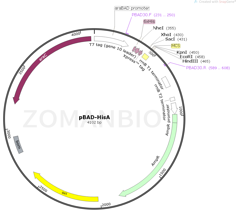 pBAD-HisA質(zhì)粒是衍生于pBR322載體。載體設(shè)計(jì)用來(lái)在大腸桿菌中進(jìn)行可調(diào)節(jié),劑量依賴性的表達(dá)和純化重組目的蛋白。使大腸桿菌araBAD啟動(dòng)子(pBAD)增強(qiáng)了大腸桿菌重組蛋白可溶性表達(dá)的水平。pBAD/His和pBAD/Myc His載體上的調(diào)節(jié)蛋白AraC能夠調(diào)控pBad啟動(dòng)子。pBAD/Myc-His A 載體是阿拉伯糖調(diào)控載體;在無(wú)葡萄糖的培養(yǎng)基中,阿拉伯糖正向調(diào)控目的基因的表達(dá);通過(guò)調(diào)節(jié)阿拉伯糖的濃度水平來(lái)優(yōu)化目的蛋白的可溶性表達(dá)。