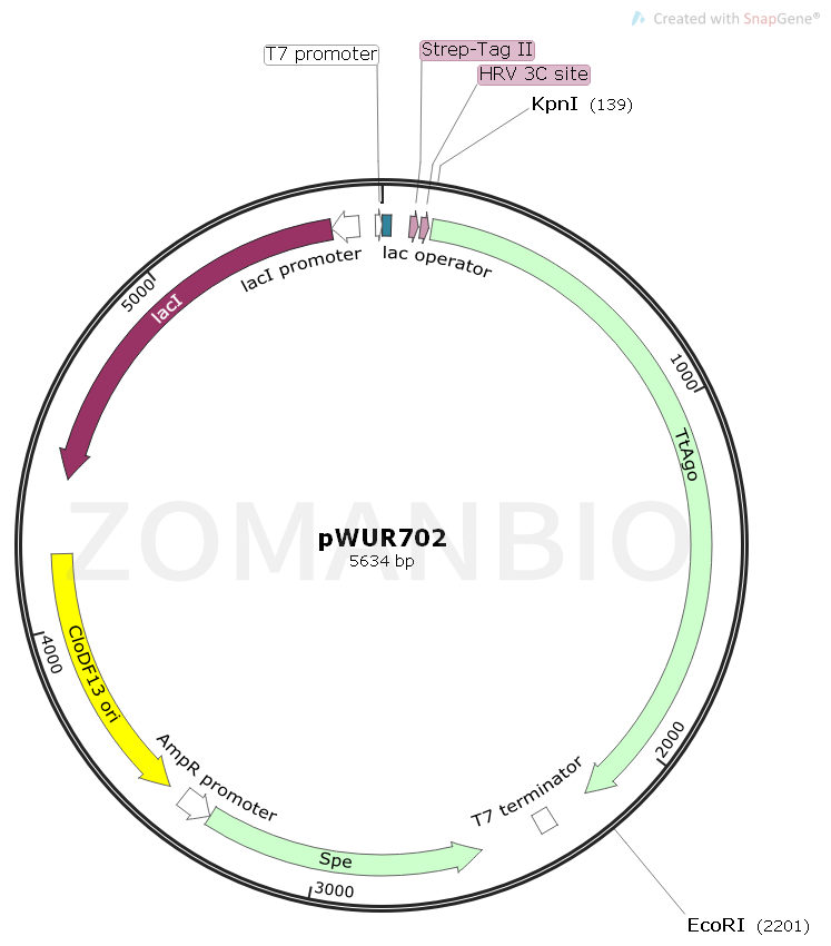 pWUR702質(zhì)??烧T導表達TtAgo蛋白,在N端攜帶有Strep-Tag II標簽和HRV 3C site蛋白酶酶切位點。本質(zhì)粒參考文獻為:DNA-guided DNA interference by a prokaryotic Argonaute.?