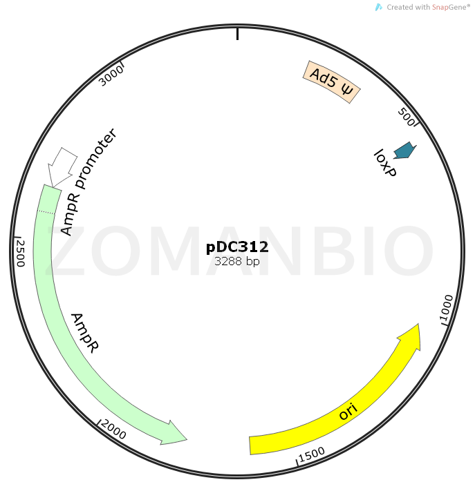 pDC312質(zhì)粒是一個腺病毒表達載體,MCS處前后無CMV啟動子和poly A終止子,方便插入完整表達盒。