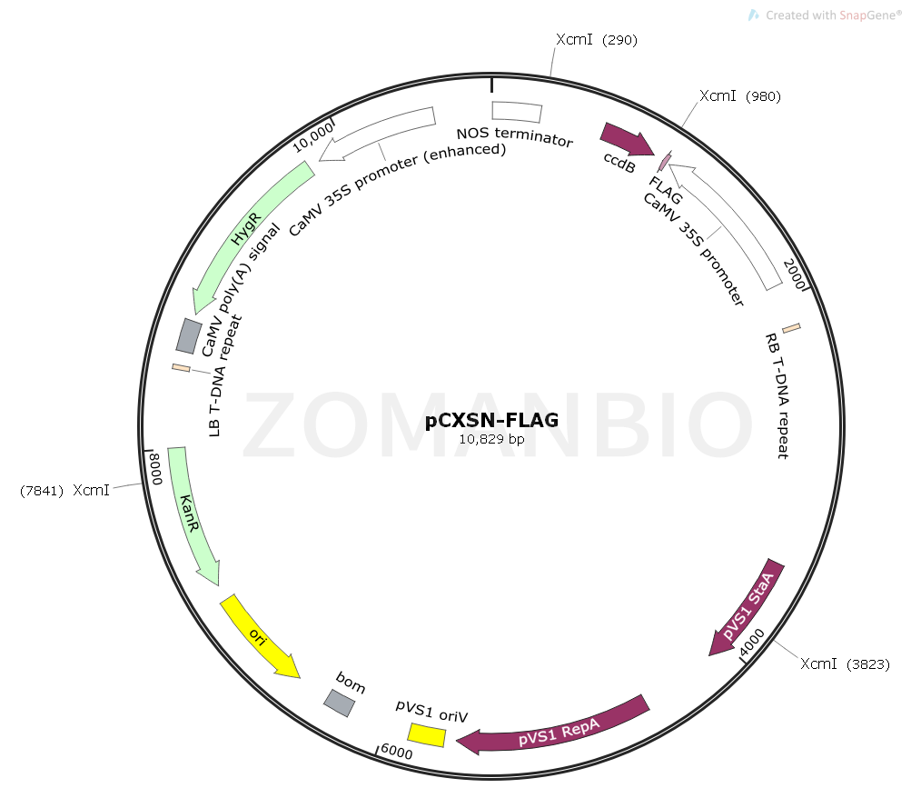 pCXSN-FLAG質(zhì)粒是一個(gè)植物過(guò)表達(dá)質(zhì)粒,35S啟動(dòng)子驅(qū)動(dòng)FLAG標(biāo)簽和目的基因融合表達(dá),在ccdb致死基因的作用下,克隆基因變得更加容易,陽(yáng)性率高。