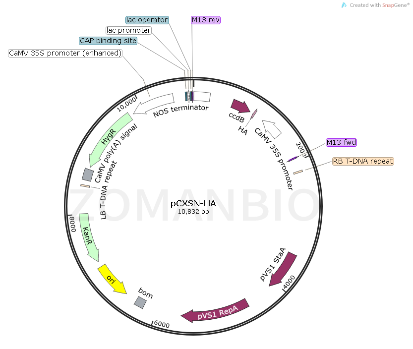 pCXSN-HA質(zhì)粒是一個(gè)植物過(guò)表達(dá)質(zhì)粒,35S啟動(dòng)子驅(qū)動(dòng)HA和目的基因融合表達(dá),在ccdb致死基因的作用下,克隆基因變得更加容易,陽(yáng)性率高。