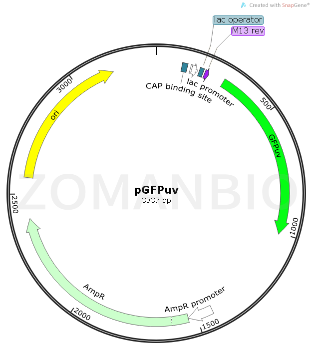 pGFPuv是一個大腸桿菌綠色熒光表達質粒。pGFPuv carries the“cycle 3”variant of GFP described by Crameri et al. (1). This gene was cloned between the two MCSs of the pUC19 derivative pPD16.43 (2). The GFPuv gene canbe easily excised from pGFPuv. Alternatively, the GFPuv coding sequence can be amplified by PCR. The GFPuv gene was inserted in frame with the lacZ initiation codon from pUC19 so that a β-galactosidase-GFPuv fusionprotein is expressed from the lac promoter in E. coli . Note, however, that if you excise the GFPuv coding sequence using a restriction site in the 5' MCS, the resulting fragment will encode the native (i.e.,non-fusion) GFPuv protein. The pUC backbone of pGFPuv provides a high copy number origin of replication and ampicillin resistance gene for propagation in E. coli.