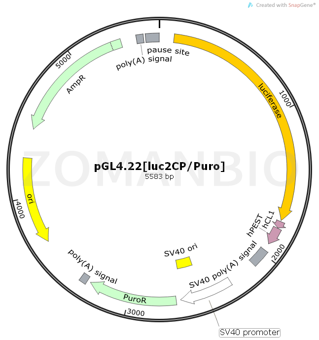 pGL4.22[luc2CP/Puro]是一個哺乳細(xì)胞單熒光素酶報告質(zhì)粒。The pGL4.22[luc2CP/Puro] Vector encodes the luciferase reporter gene luc2CP (Photinus pyralis) and is designed for high expression and reduced anomalous transcription. This vector contains a mammalian selectable marker for puromycin resistance in which the number of transcription factor binding sites has been reduced and mammalian codon usage optimized. The vector is engineered with fewer consensus regulatory sequences for reduced background and a decreased risk of anomolous transcription and has a synthetic reporter gene, which has been codon optimized for mammalian expression. The pGL4.22[luc2CP/Puro] Vector is a basic vector with no promoter. However, it contains a multiple cloning region that allows cloning of a promoter of choice. The luc2CP reporter gene contains two protein destabilization sequences, hCL1 and hPEST. The protein encoded by luc2CP responds more quickly and with greater magnitude to changes in transcriptional activity than the luc2 gene, its more stable counterpart.